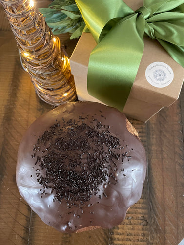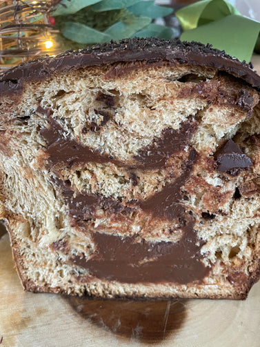 Stuffed Chocotone - a sweet bread loaf with chocolate chips - filled with creamy Chocolate Brigadeiro with blend of Milk and Dark Chocolate on top
