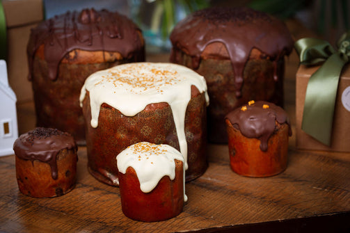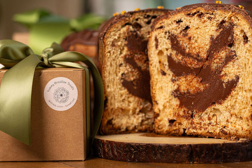 Stuffed Chocotone - a sweet bread loaf with chocolate chips- filled with creamy Chocolate Truffle with blend of Milk and Dark Chocolate on top