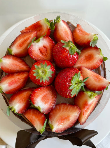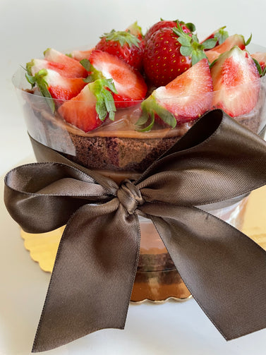 Soft and moist chocolate dough, filled with chocolate brigadeiro and fresh strawberries, topped with Strawberries.